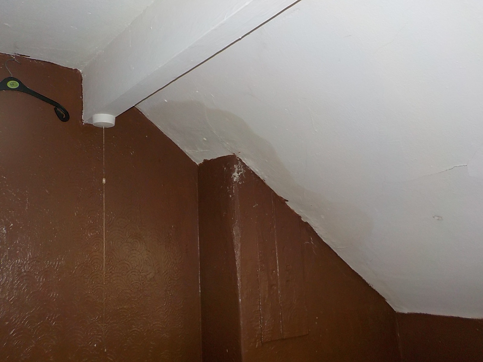 Front bedroom wall: Dampness most likely caused by a previously leaking gutter, now reportedly repaired.