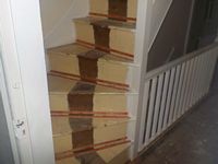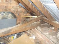 Ashby-de-la-Zouch semi-detached house with cellar and attic room from just after the turn of the century. The chimneys have been demolished probably because they were in very poor condition from attack by condensates of combustion and the original tiles roof replaced with a modern concrete tile one which raised concern about the structures ability to support the extra weight. Poor cellar ventilation had encouraged dampness which has caused decay of the floor structure and encouraged beetles to infest the floor planks. There was no protecting the occupier of the attic room from fire and the stairs to the attic room were steep with winding treads and difficult to use in the dark. External redner appeared to have used plaster rather than a sand and lime render which would make it vulnerable to water damage. The property had old lead water supply pipe and a corroding metal gas pipe. Insualtion of the attic room was considerably substandard.