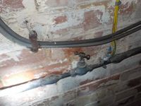 Ashby-de-la-Zouch semi-detached house with cellar and attic room from just after the turn of the century. The chimneys have been demolished probably because they were in very poor condition from attack by condensates of combustion and the original tiles roof replaced with a modern concrete tile one which raised concern about the structures ability to support the extra weight. Poor cellar ventilation had encouraged dampness which has caused decay of the floor structure and encouraged beetles to infest the floor planks. There was no protecting the occupier of the attic room from fire and the stairs to the attic room were steep with winding treads and difficult to use in the dark. External redner appeared to have used plaster rather than a sand and lime render which would make it vulnerable to water damage. The property had old lead water supply pipe and a corroding metal gas pipe. Insualtion of the attic room was considerably substandard.